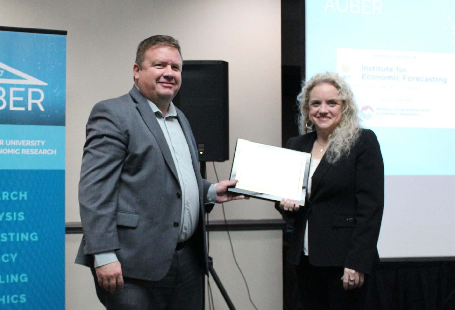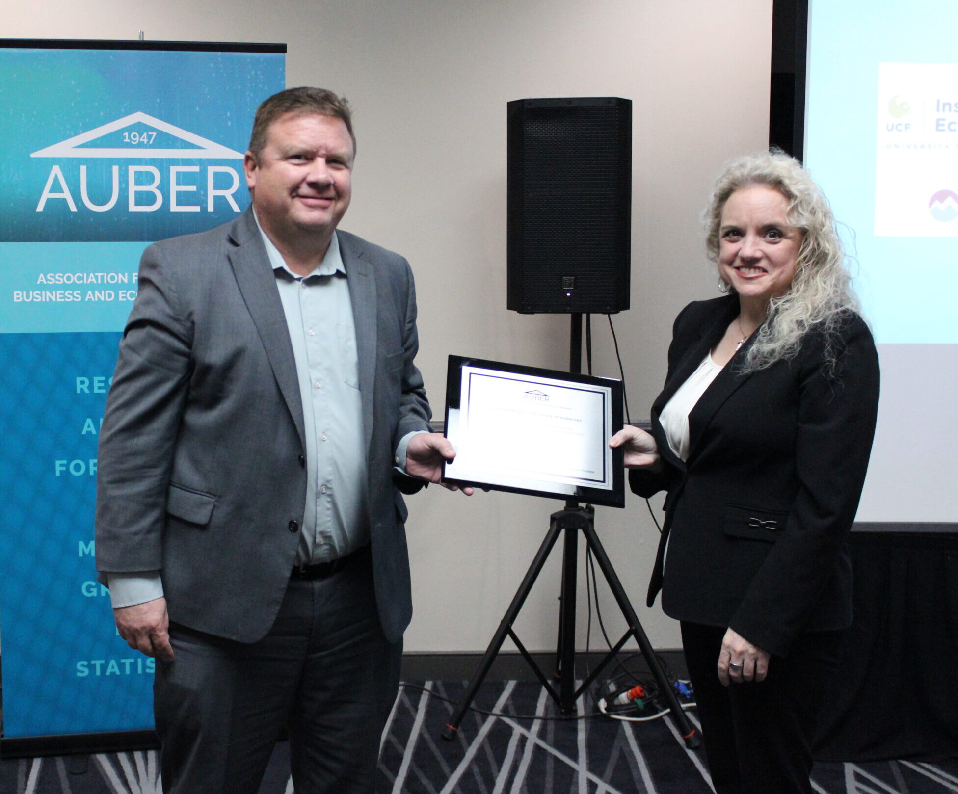 Bruce Kellison, director of the Bureau of Business Research at University of Texas at Austin, was presented with the 2022 AUBER Fellow Award for his many years of service and dedication to the organization.